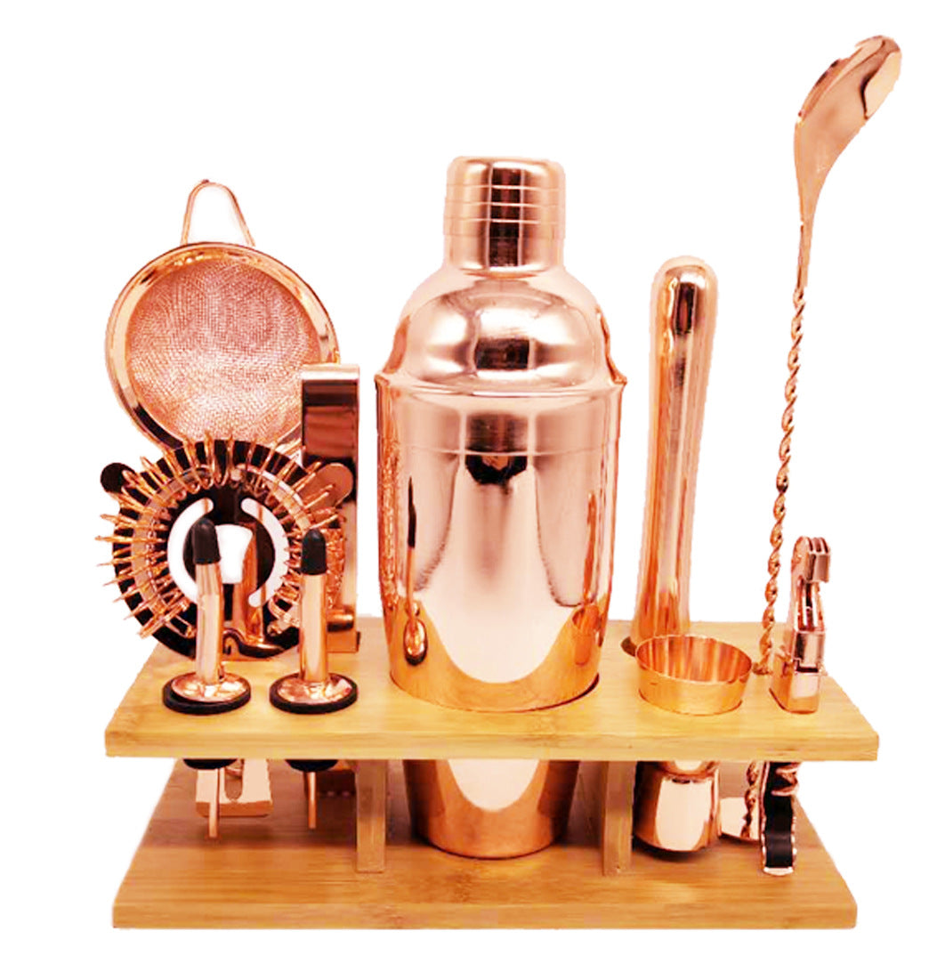 Electroplated rose gold stainless steel cocktail shaker set of 11 wooden racks (can choose not to bring wooden racks)