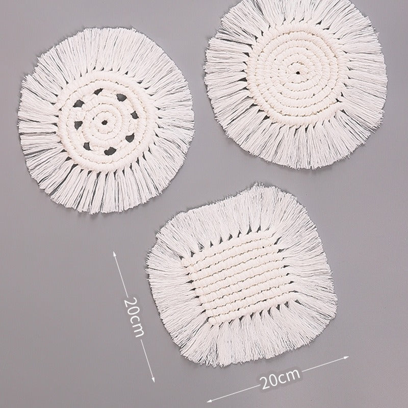 Nordic style hand woven cotton rope coaster insulation pad, white tassel desktop minimalist decorative pad