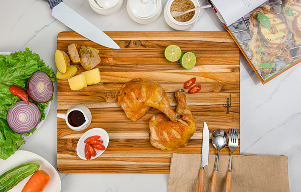 Feature – 100% teak wood natural pattern; rustic boards with juice groove; smooth polish no sharp edge thorn splinter; comfy hand grip for better grab no-slip convenient holding; solid wooden platter; food-grade safe easy to clean